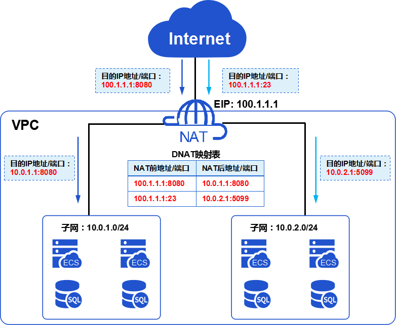 通过配置NAT网关和DNAT规则,指定一个EIP(100.1.1.1),并指定需要对公网提供服务的ECS(私网地址分别为10.0.1.1和10.0.2.1),以及需要映射的公网端口号(分别为8080、23)和私网端口号(分别为8080、5099),从而生成一张NAT地址和端口的映射表。