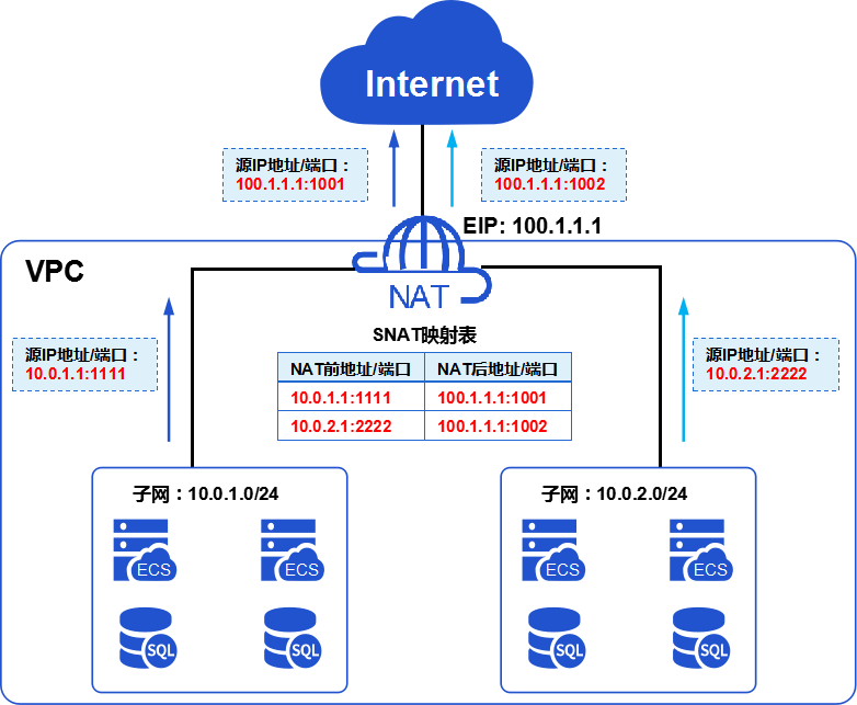 通过配置NAT网关和SNAT规则,指定一个EIP(100.1.1.1),以及需要转化的私网IP地址网段(10.0.1.0/24和10.0.2.0/24),从而生成一张NAT地址和端口的映射表。您无需指定端口号,NAT网关会识别报文中的端口并自动生成IP地址和端口的映射关系。